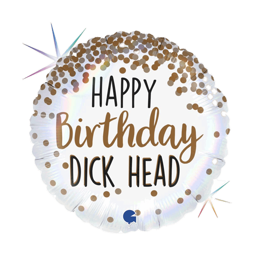 Happy Birthday Dick Head ballong. Denna ballong är perfekt om man vill fira någon på ett humoristiskt sätt som garanterat kommer ge ett gott skratt. Denna folieballong är designad att blåsas upp med helium för att uppnå bästa effekt. Med helium kommer denna ballong att sväva i minst 3 dagar och upp till över en vecka. En förpackning innehåller 1st ballong.