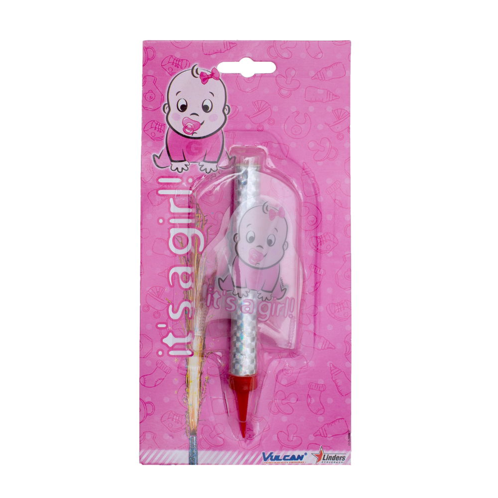 Fira den lilla nyheten med en sprakande isfackla med texten "det är en tjej" – ett festligt inslag som lyser upp varje babyshower. Säljes styckvis.