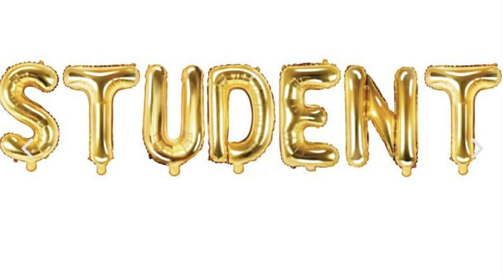 1st Guldfärgade Bokstavsballonger 35 cm höga som bildar ordet student